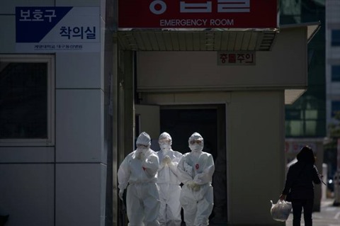 | Personnel soignant devant un hôpital à Daegu, en République de Corée, le 12 mars. |