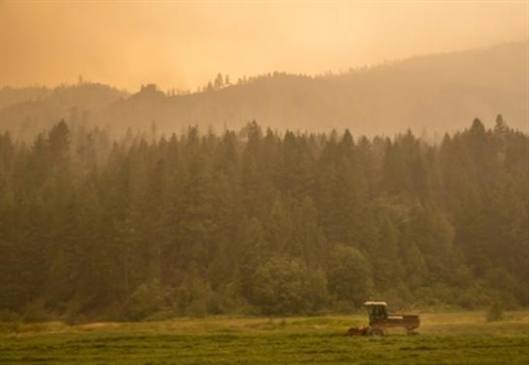 | Nuage de fumée provoqué par les incendies qui ravagent l'État de Washington aux États-Unis, le 23 août près d'Omak. |