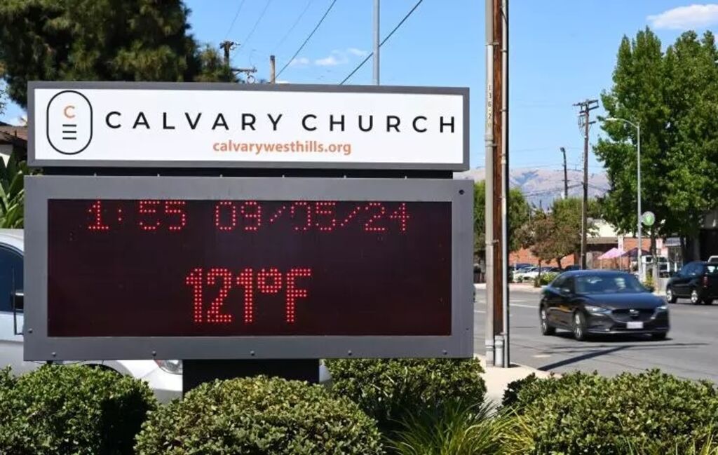 | L'écran de l'église Cavalry à Woodland Hills, en Californie, affiche une température de 121 degrés Fahrenheit (49,4 degrés Celsius) le 5 septembre. |