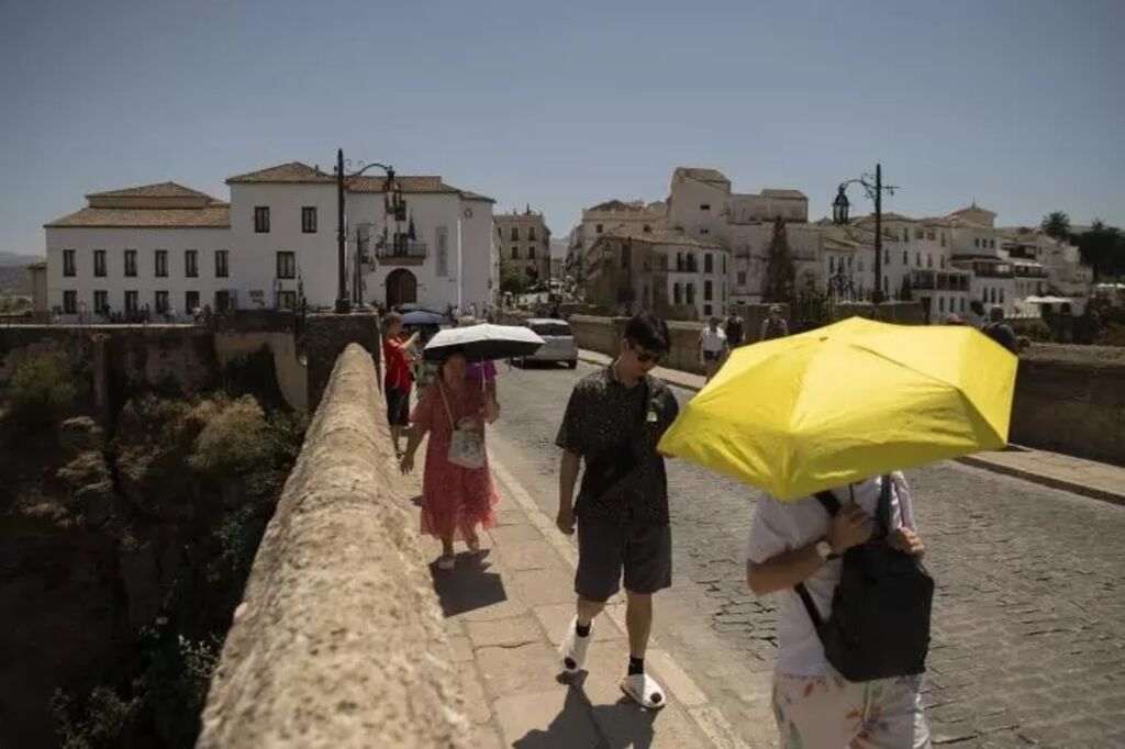 | Des touristes se protègent du soleil avec des parapluies le 9 août 2024 à Ronda, en Espagne, touché par une vague de chaleur. |