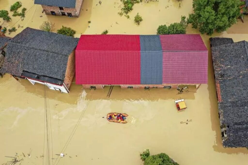 | Des maisons touchées par les inondations suite aux fortes pluies causées par le typhon Gaemi le 28 juillet 2024 à Zixing, dans la province du Hunan, dans le Centre de la Chine. |