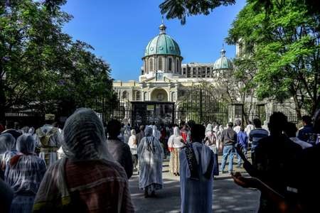 | Les chrétiens orthodoxes prient à l'extérieur de la cathédrale Medhane Alem, fermée pour cause de coronavirus, Addis Abeba, 5 avril. |