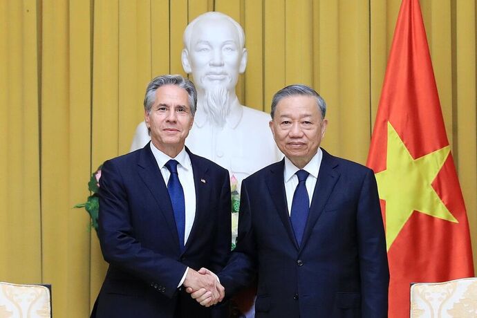 Dans la soirée du 27 juillet, lors de son voyage au Vietnam pour rendre hommage au feu secrétaire général du Parti communiste du Vietnam (PCV), Nguyên Phu Trong, et présenter ses condoléances à son épouse Ngô Thi Mân et à sa famille, le secrétaire d'État américain Antony Blinken a remis la lettre de condoléances du président Joe Biden au président Tô Lâm, suite au décès du leader du PCV.