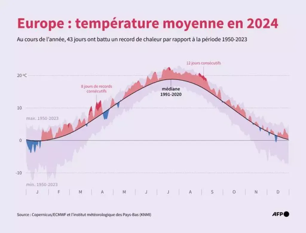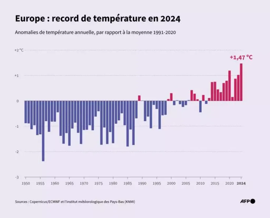 En 2024, la chaleur à la surface du continent n'a jamais été aussi élevée. Cela a contribué à augmenter la température des mers et océans limitrophes, qui ont aussi atteint des records l'an dernier, et à faire fondre les glaciers européens à un rythme sans précédent.