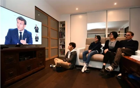 | Famille française devant l'interview télévisée du président Emmanuel Macron, annonçant l'imposition de couvre-feux nocturnes, à Fouesnant (Ouest), le 14 octobre. |