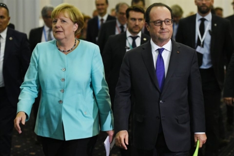 | La chancelière allemande, Angela Merkel et le président français, François Hollande, le 16 septembre 2016 à Bratislava. Photo : AFP/VNA/CVN |