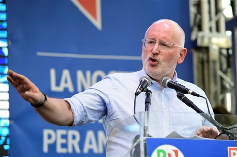 | Le Néerlandais Frans Timmermans, candidat à la présidence de la Commission européenne, prononce un discours le 24 mai à Milan. |