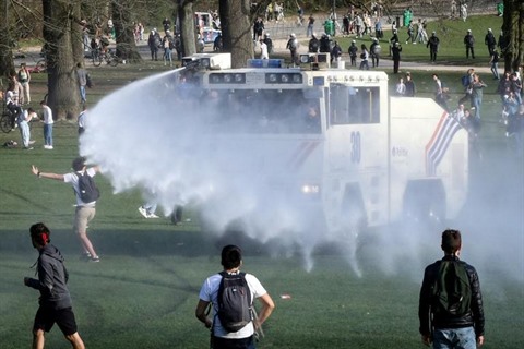 | La police fait usage de canons à eau pour disperser un rassemblement dans un parc, le 1er avril à Bruxelles. |