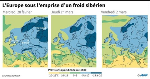 | Carte de la vague de froid sibérien qui atteint l'Europe, prévisions météo à 10h00 pour les 28 février, 1er et 2 mars. |
