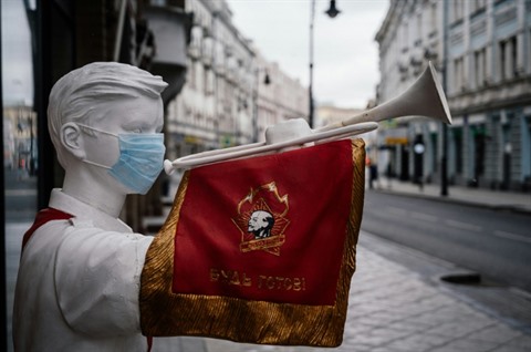 | Une statue bien protégée, le 30 mars à Moscou. |