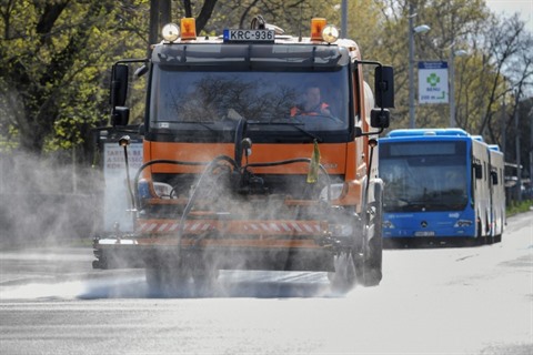 | Un camion désinfecte les rues de Budapest, le 30 mars. |