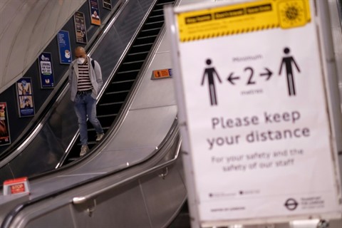 | Pancartes pour respecter les distances dans le métro londonien, le 13 mai. |