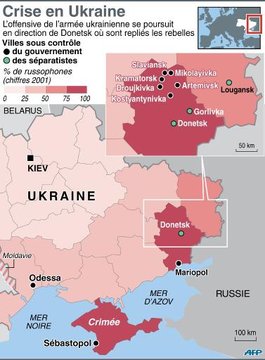 "Nous sommes déjà à 20 km de Donetsk", a cependant affirmé mercredi 9 juillet à Slaviansk le ministre de l'Intérieur ukrainien Arsen Avakov. "Nous allons les chasser (les rebelles) jusqu'à ce qu'ils se retrouvent dans l'autre Donetsk" (petite ville russe du même nom proche de la frontière), a-t-il ajouté lors d'une rencontre avec les habitants.