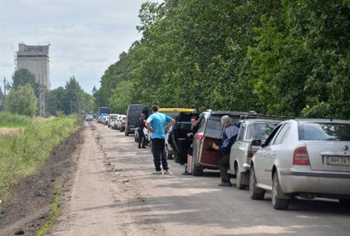 | Des habitants de Slaviansk attendent avec leurs véhicules de rentrer chez eux, le 8 juillet en Ukraine. Photo : AFP/VNA/CVN |
