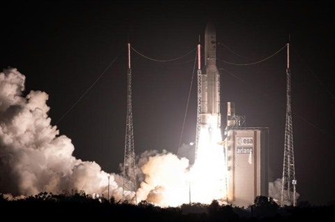 | Décollage d'une fusée Ariane V du centre spatial européen, le 26 novembre 2019 à Kourou, en Guyane française. |