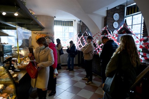 | Des clients font la queue dans un café proposant des plats à emporter, le 2 novembre à Saint-Pétersbourg. |