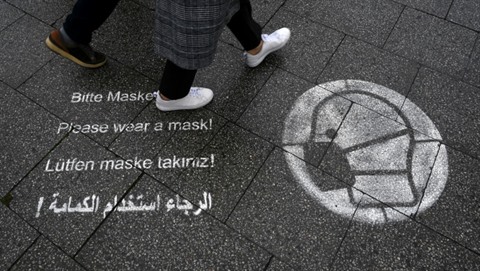 | Des messages sur le sol en différentes langues appelant à porter un masque, le 14 octobre à Berlin. |