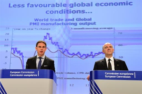 | Le commissaire Pierre Moscovici (droite) et le vice-président de la Commission européenne Jyrki Katainen lors de la conférence de presse sur les prévisions économiques de la Commission, le 4 novembre à Bruxelles. |