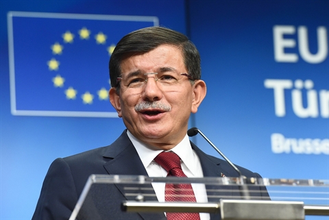 | Le chef du gouvernement turc Ahmet Davutoglu lors d'une conférence de presse, le 29 novembre à Bruxelles. |