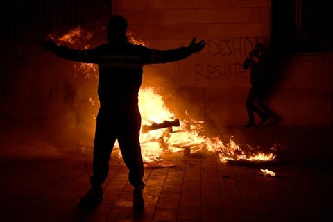 | Un manifestant devant un feu de barricades lors d'une manifestation à Barcelone le 31 octobre. |