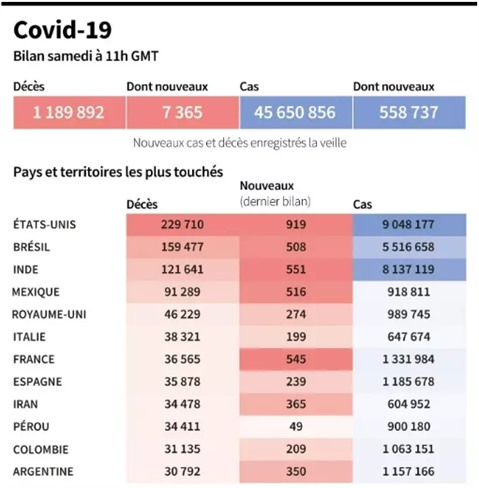 Les pays européens constituent la troisième région la plus touchée avec 10,46 millions de cas, derrière l'Amérique latine et les Caraïbes (11,3 millions de cas) et l'Asie (10,57). Sur l'ensemble de la planète, ce sont plus de 46 millions d'êtres humains qui ont été atteints, dont près de 1,2 million ont perdu la vie.