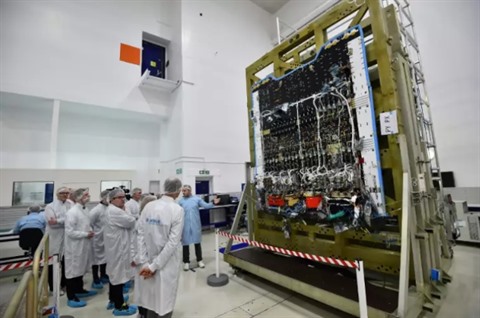 | Le satellite Quantum dans la salle blanche d'Airbus Defence System à Portsmouth, en Grande-Bretagne, le 26 février 2018. |