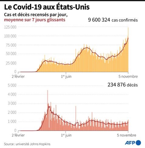 De l'autre côté de l'Atlantique, les États-Unis, en plein suspense électoral, vont eux aussi de record en record. Dans ce pays, de loin le plus endeuillé au monde par la pandémie avec 234.876 décès, plus de 120.000 nouveaux cas positifs au coronavirus en 24 heures ont été recensés jeudi 5 novembre, selon l'université Johns Hopkins.