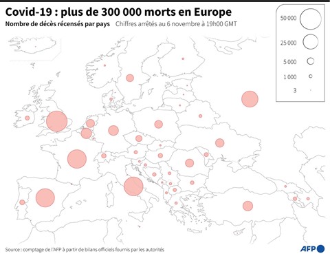 Selon un comptage effectué par l'AFP à partir de sources officielles, la pandémie a fait plus de 300.000 morts sur le continent européen, pour plus de douze millions d'infections. C'est la deuxième zone du monde la plus endeuillée, derrière l'Amérique latine et les Caraïbes (408.841 décès, 11.490.126 cas).