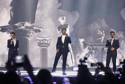 | Le groupe italien Il Volo pendant une répétition avant la finale du Consours Eurovision le 22 mai 2015 à Vienne. |