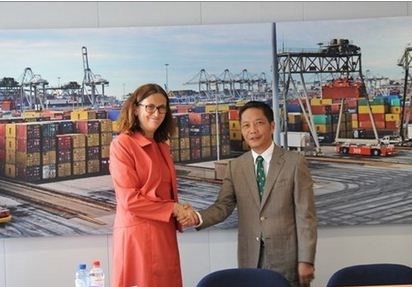 | Le ministre vietnamien de l'Industrie et du Commerce, Trân Tuân Anh, et la commissaire européenne au Commerce, Cecilia Malmström à Bruxelles. |