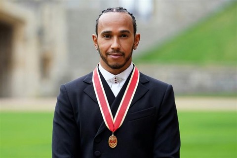 | Le coureur automobile de F1 britannique Lewis Hamilton pose avec sa médaille de chevalier, le 15 décembre dans les jardins du château de Windsor, à l’Ouest de Londres. |
