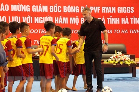 | Le directeur du PVF, Ryan Giggs, serre la main des footballeurs en herbe du club de football scolaire du district de Thach Hà, province de Hà Tinh. |