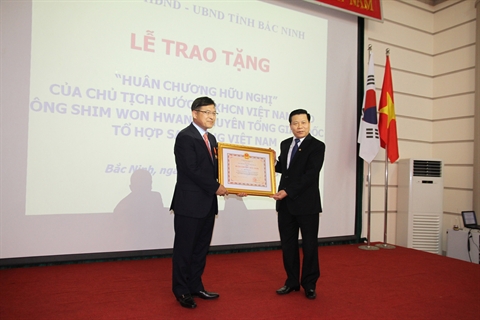 | La cérémonie de remise de l’Ordre de l’Amitié du président de la République à l’ancien directeur général de la compagnie Samsung Vietnam, Shim Won Hwan (gauche), le 15 mai à Bac Ninh (Nord). |