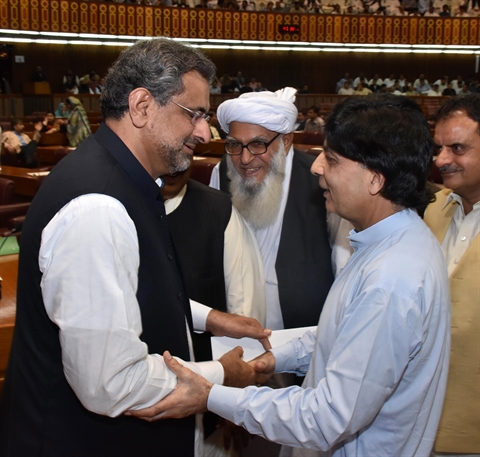 | Shahid Khaqan Abbasi (gauche), le 1er août au parlement du Pakistan. |