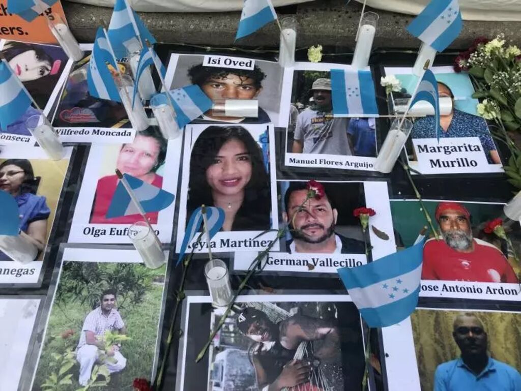 | Un mémorial improvisé avec les photos de victimes de narco-trafiquants, devant le palais de justice où est jugé l'ancien président du Honduras, Juan Orlando Hernandez, pour trafic international de drogue, le 7 mars 2024 à New York. |