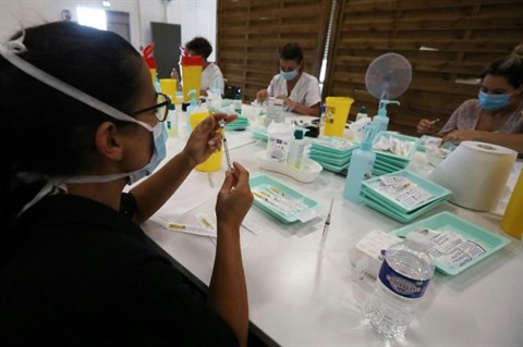 | Préparation de seringues dans un centre de vaccination contre le COVID-19, le 18 juillet à Perpignan, dans le Sud de la France. |
