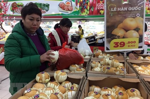 | Des poires importées de République de Corée sur un stand du supermarché Big C Thang Long, à Hanoï. |