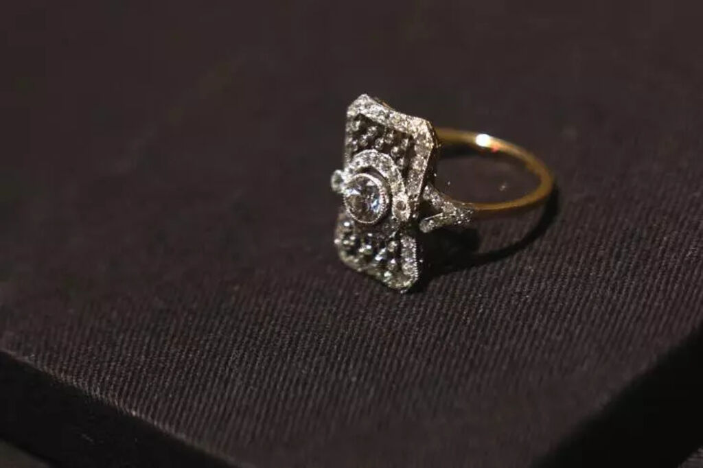 | Une bague édouardienne présentée à l'exposition "XXL Titanic", le 18 juillet 2023 à Paris. |