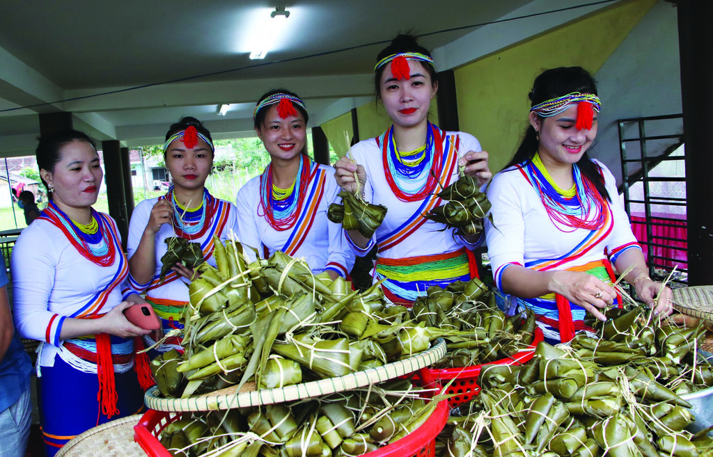 | Des femmes Cor présentent leurs gâteaux traditionnels faits à partir de riz gluant. |