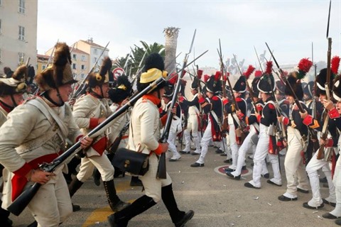 | Des comédiens en costumes d'époque rejouent une bataille napoléonienne, le 13 août à Ajaccio, en Corse. |