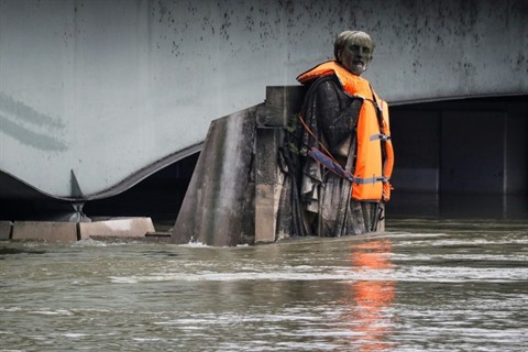 | Le zouave du Pont de l'Alma à Paris équipé d'un gilet de sauvetage le 4 février pour sensibiliser aux effets du dérèglement climatique. |