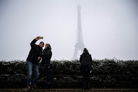 | Un couple fait un selfie devant la tour Eiffel, le 5 février à Paris. |