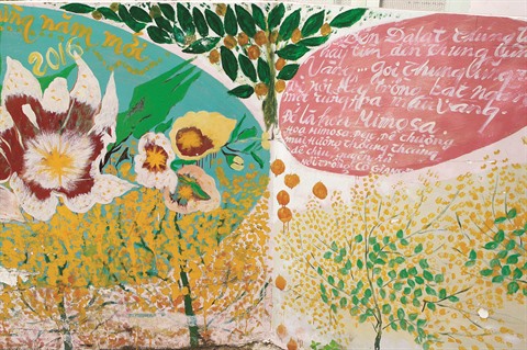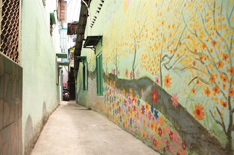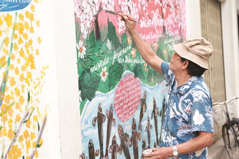 Ces deux dernières années, qu’il fasse soleil ou qu’il pleuve, Nguyên Van Minh a continué son œuvre : embellir son quartier. Si certains peignent sur des toiles, lui adore peindre sur les murs du quartier Vân Dôn (4e arrondissement) où il vit. Né à Dà Lat (province de Lâm Dông, hauts plateaux du Centre), passionné de peinture depuis son plus jeune âge, il n’a pu exercer cette activité autant qu’il l’aurait souhaité en raison de problèmes de santé.
