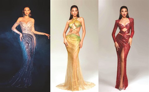 | (De gauche à droite) trois créations de Minh Tuân portées par Thùy Tiên au Miss Grand International 2021 : "Whirlpool galaxy gown", "Crown Dress" et "Red diamond gown". |