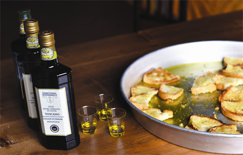 | Des bouteilles d’huile d’oliveet des morceaux de pain grillés en dégustation au pressoir de Cesare Buonamici,à Fiesole, près de Florence, en Toscane. |