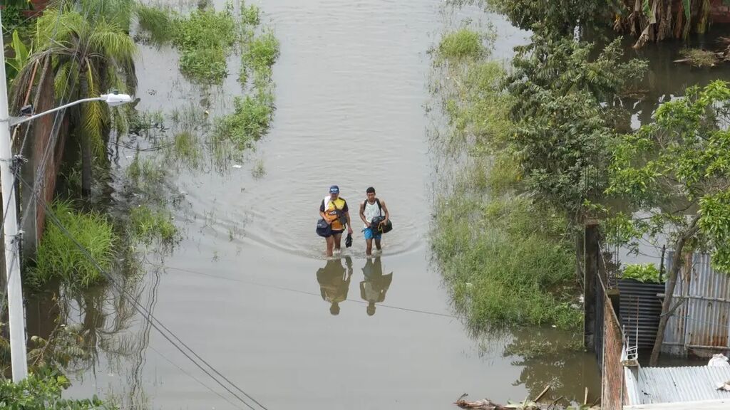 | Des habitants lors d'une inondation à Milagro, en Équateur, le 12 mars. |
