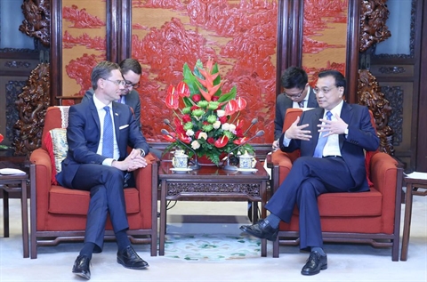 | Li Keqiang (droite) et Jyrki Katainen, le 28 septembre en Chine. |