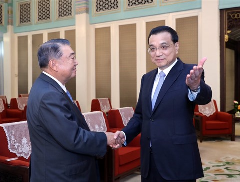 | Le Premier ministre chinois Li Keqiang (droite) et Tadamori Oshima, président de la Chambre des représentants du Japon, le 24 juillet à Pékin. Photo: Xinhua/VNA/CVN |
