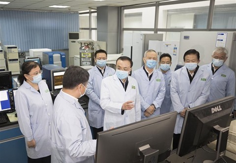 | Le Premier ministre chinois, Li Keqiang (2e, gauche au 1er rang) met l'accent sur la recherche scientifique dans la lutte contre le coronavirus. |