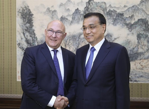 | Le Premier ministre chinois, Li Keqiang (droite), et le ministre français des Finances, Michel Sapin, le 18 septembre à Pékin. |